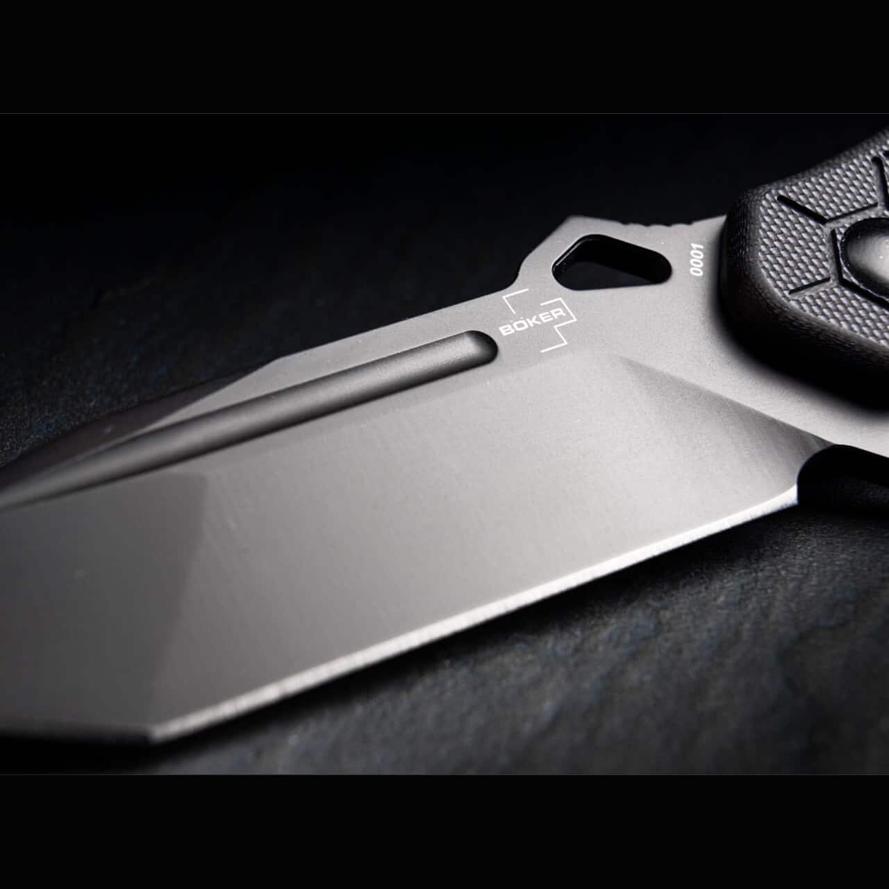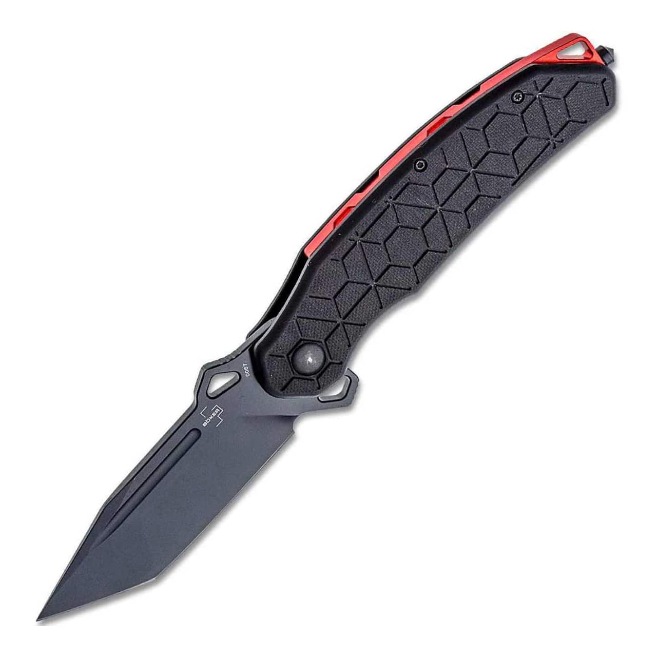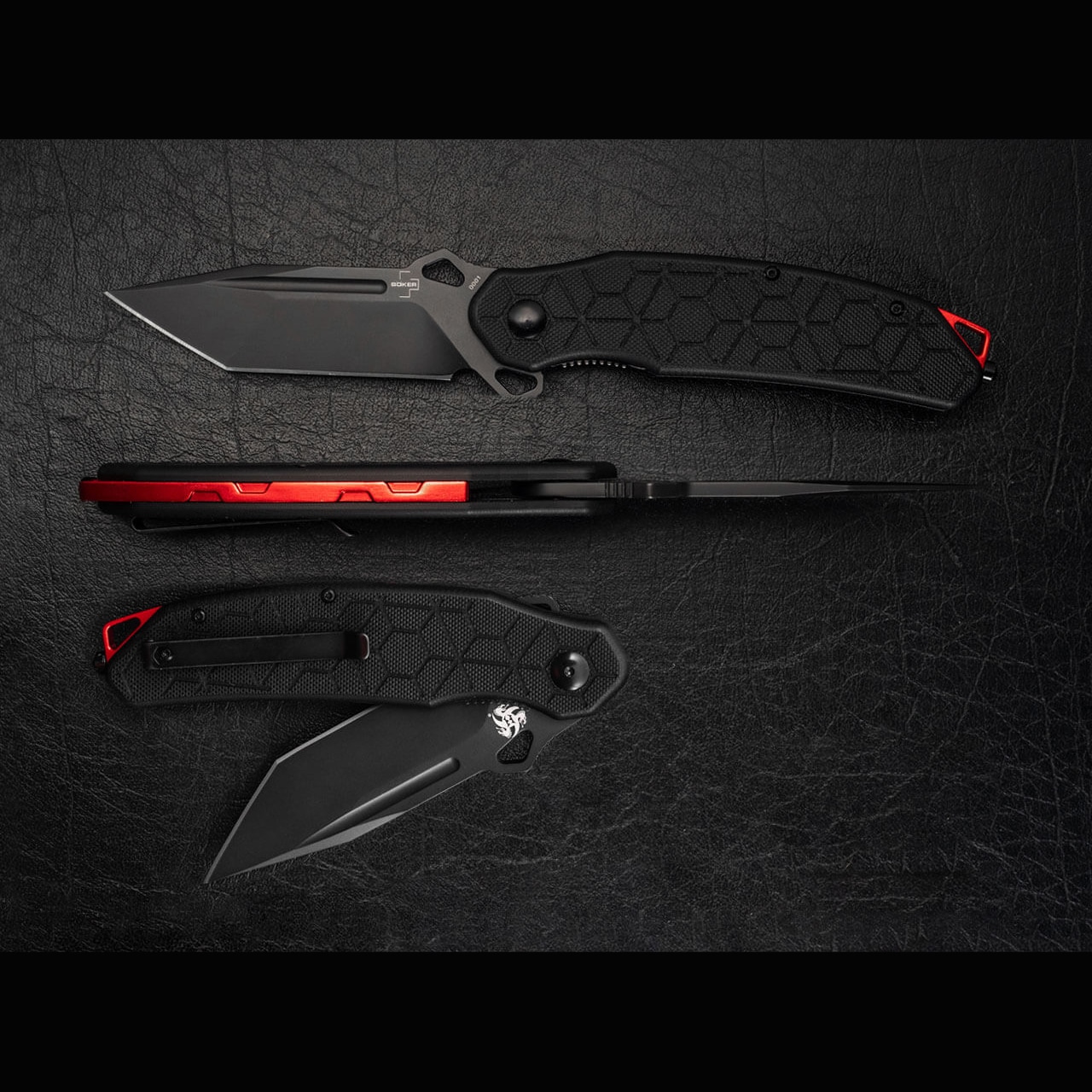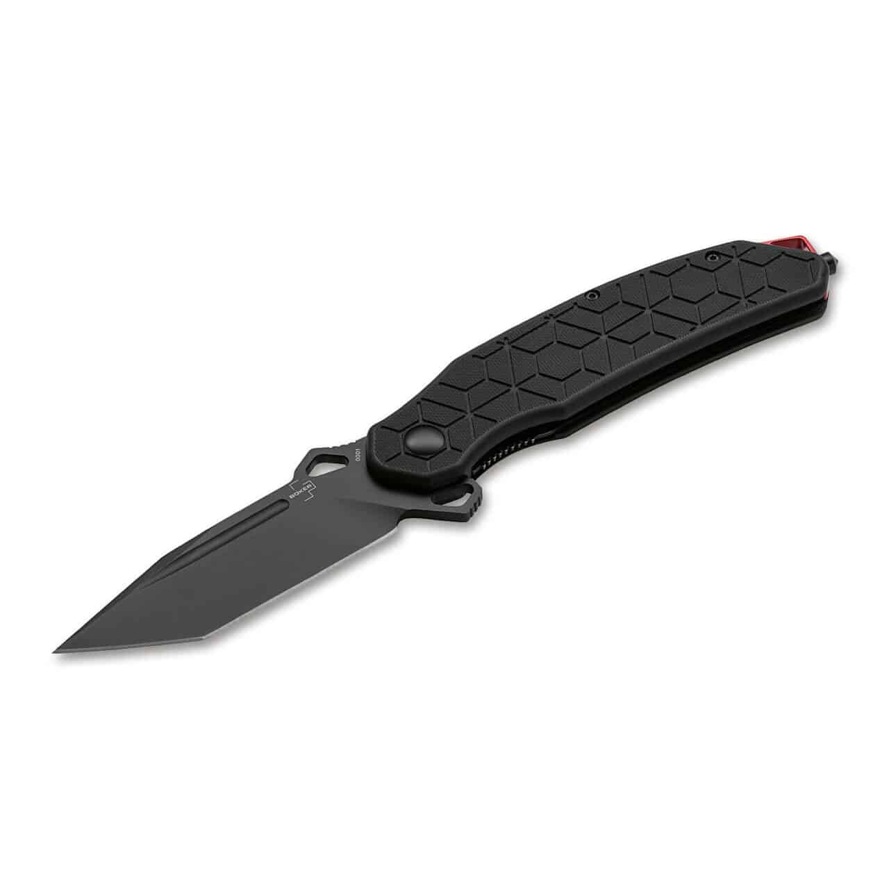 Lama modificată de tip Tanto, fabricată din oțel D2, are un înveliș negru rezistent, se deschide cu ajutorul unui flipper și este asigurată în mod fiabil de un Linerlock robust.