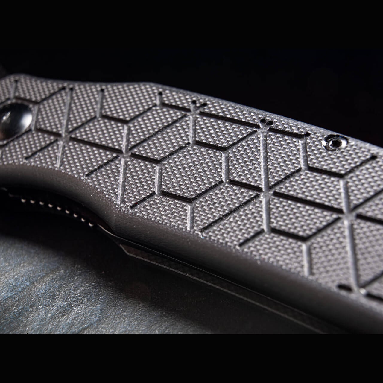 Mânerul din G10 este texturat într-un model modern de fagure de miere și se potrivește perfect în mână chiar și în condiții meteo nefavorabile. Partea destinată poziționării degetului mare este prevăzută cu striații iar împreună cu adâncitura ergonomică pentru degetul arătător, oferă aderență suplimentară.