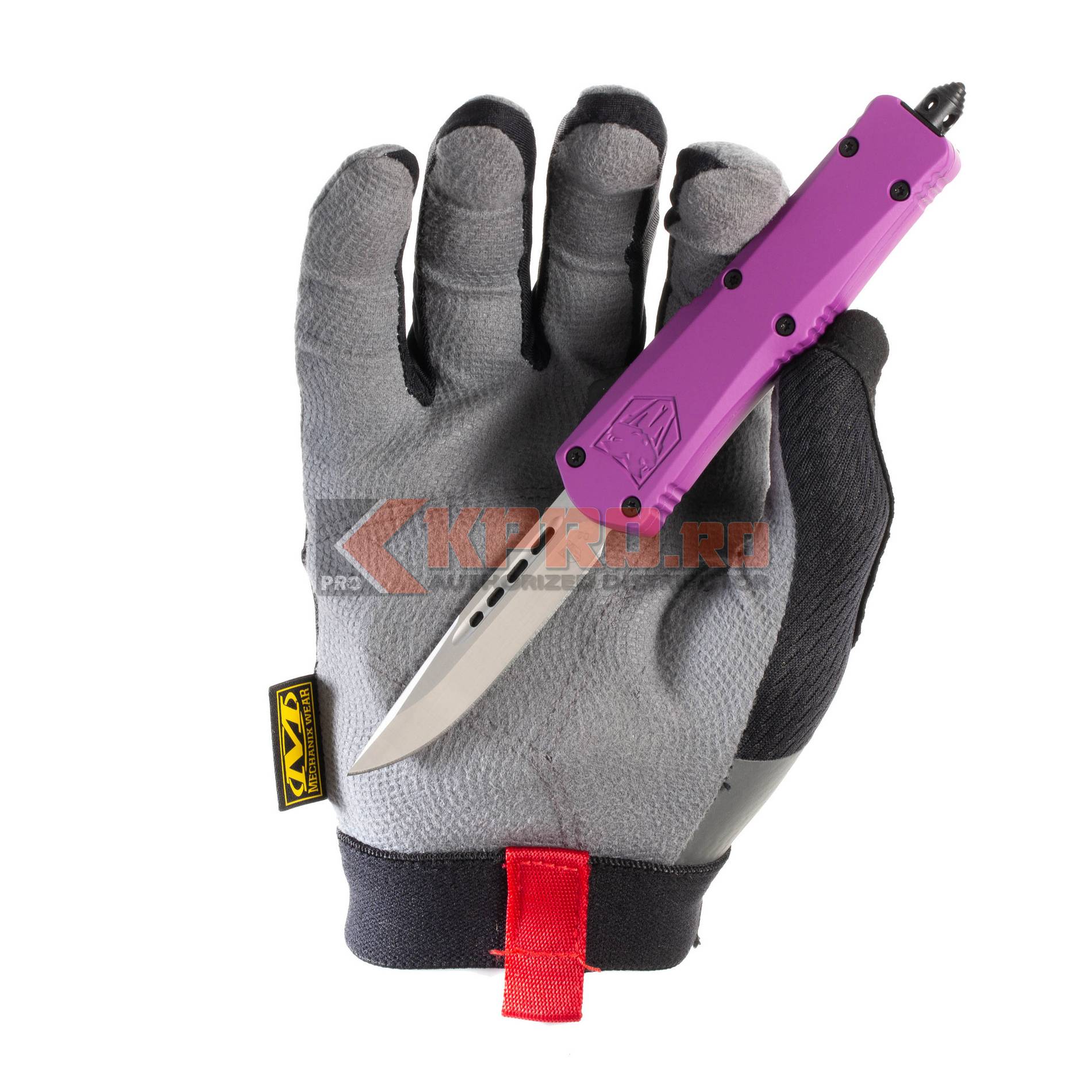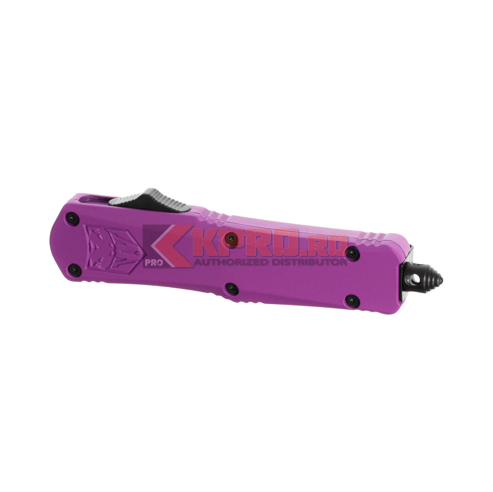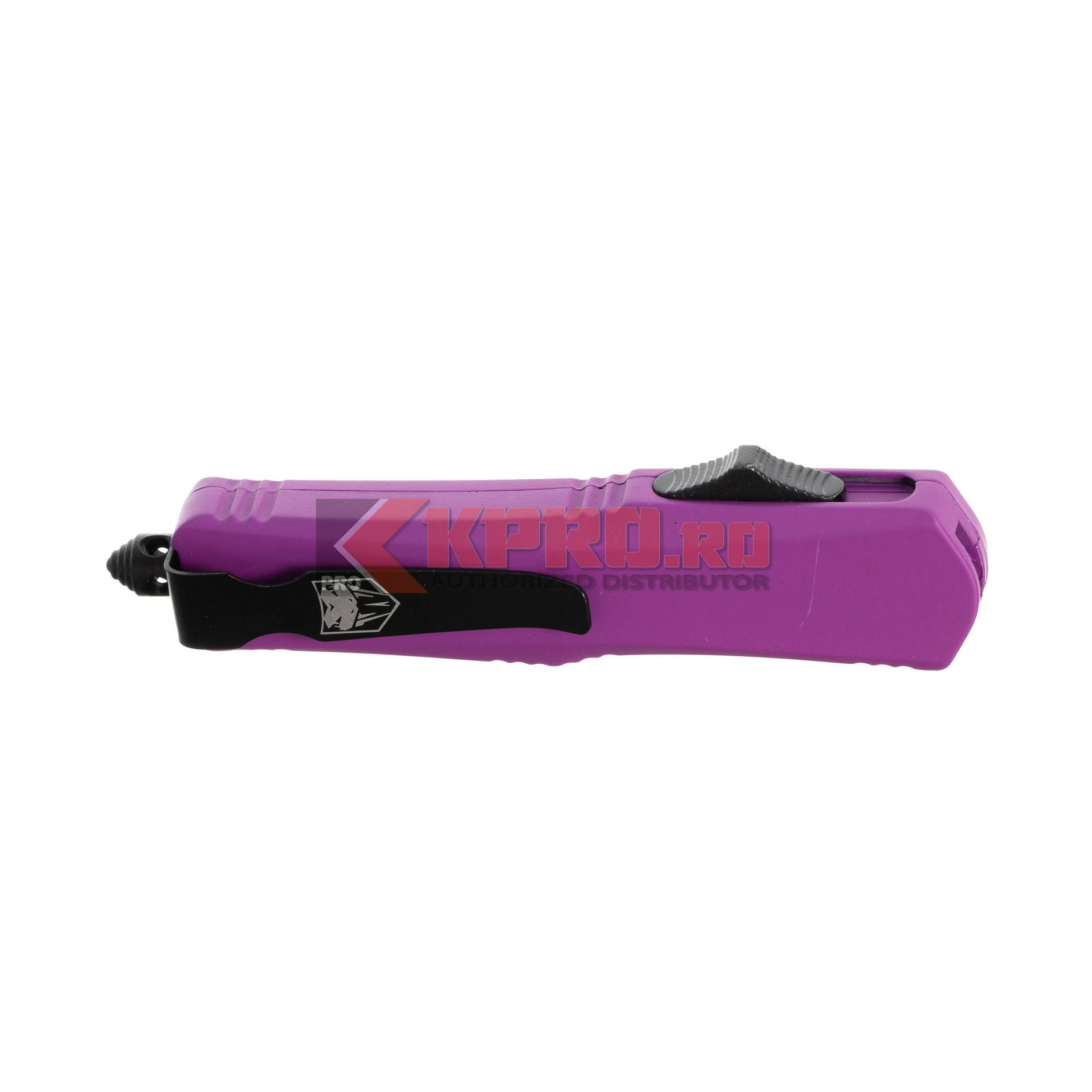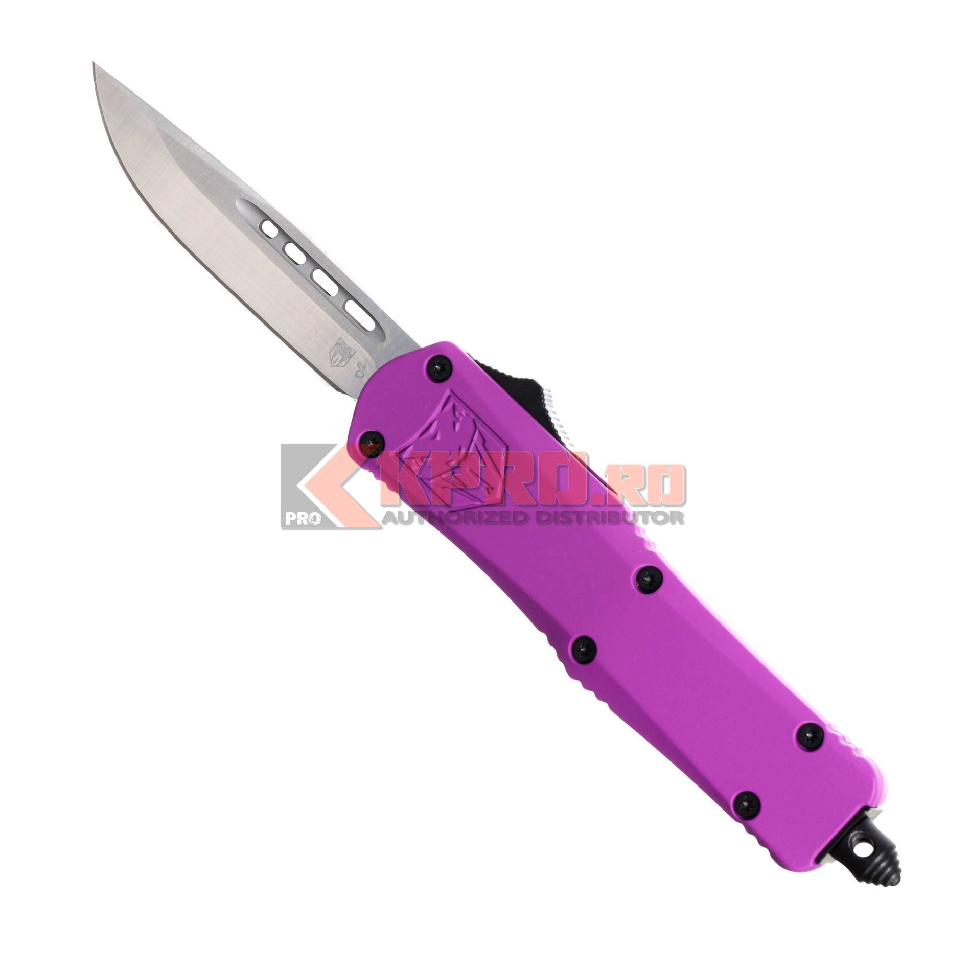 Briceag CobraTec OTF Small FS-3 OTF Purple 06CT020 cu lamă oțel D2 și mâner din aluminiu mov antiderapant, proiectat cu deschidere rapidă prin glisare.