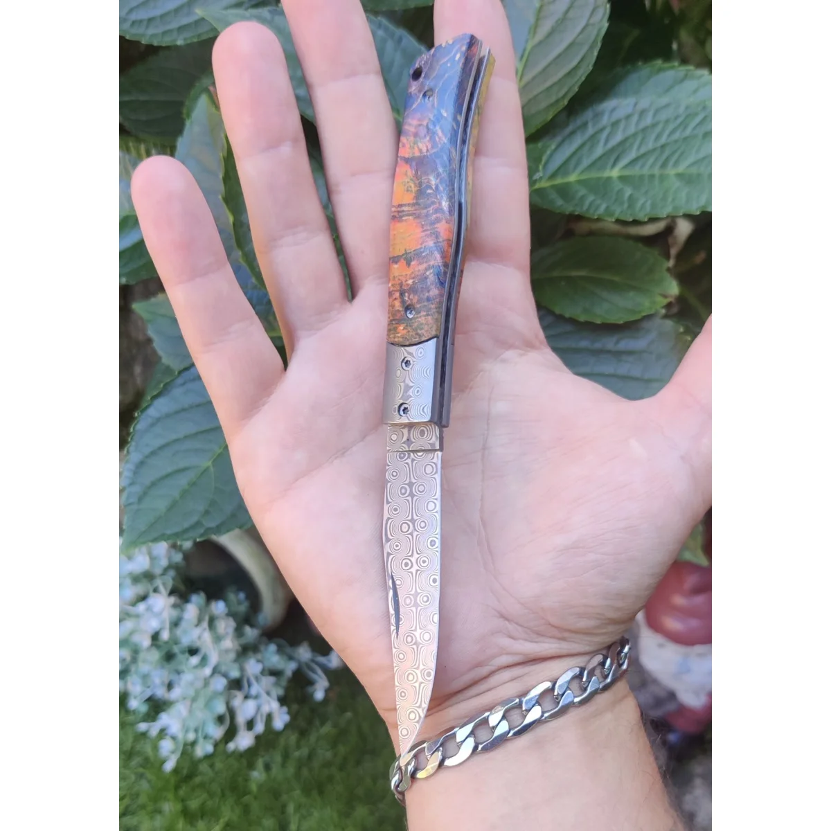 Briceag Damasc Albainox 110 Straturi Otel 18864, este un briceag de buzunar elegant, realizat din oțel damasc cu 110 straturi și mâner confecționat din lemn de rădăcină combinat cu inserții de sidef (perlă).