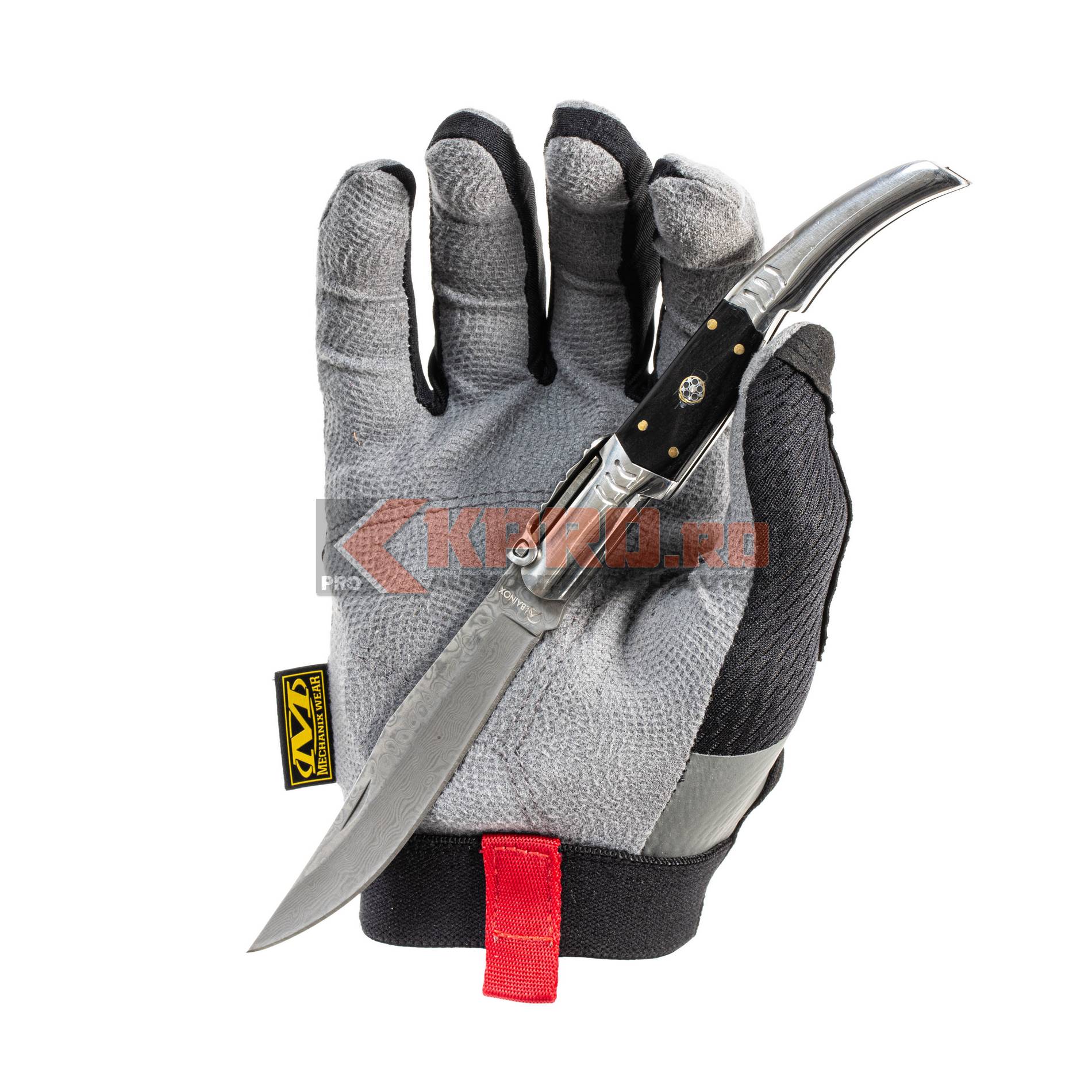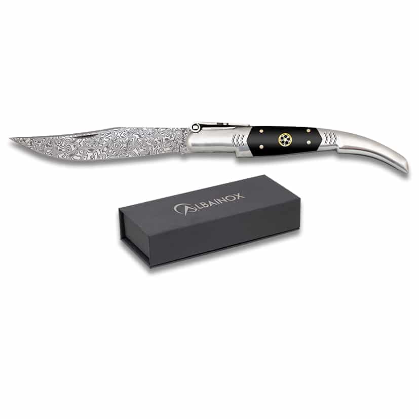 Acest cuțit pliante de calitate superioară are o lamă de 10 cm realizată din oțel Damascus 60 straturi, cu un finisaj distinctiv, perfect pentru pasionații de cuțite de colecție. Mânerul din stamina neagră oferă un grip confortabil și o utilizare sigură.