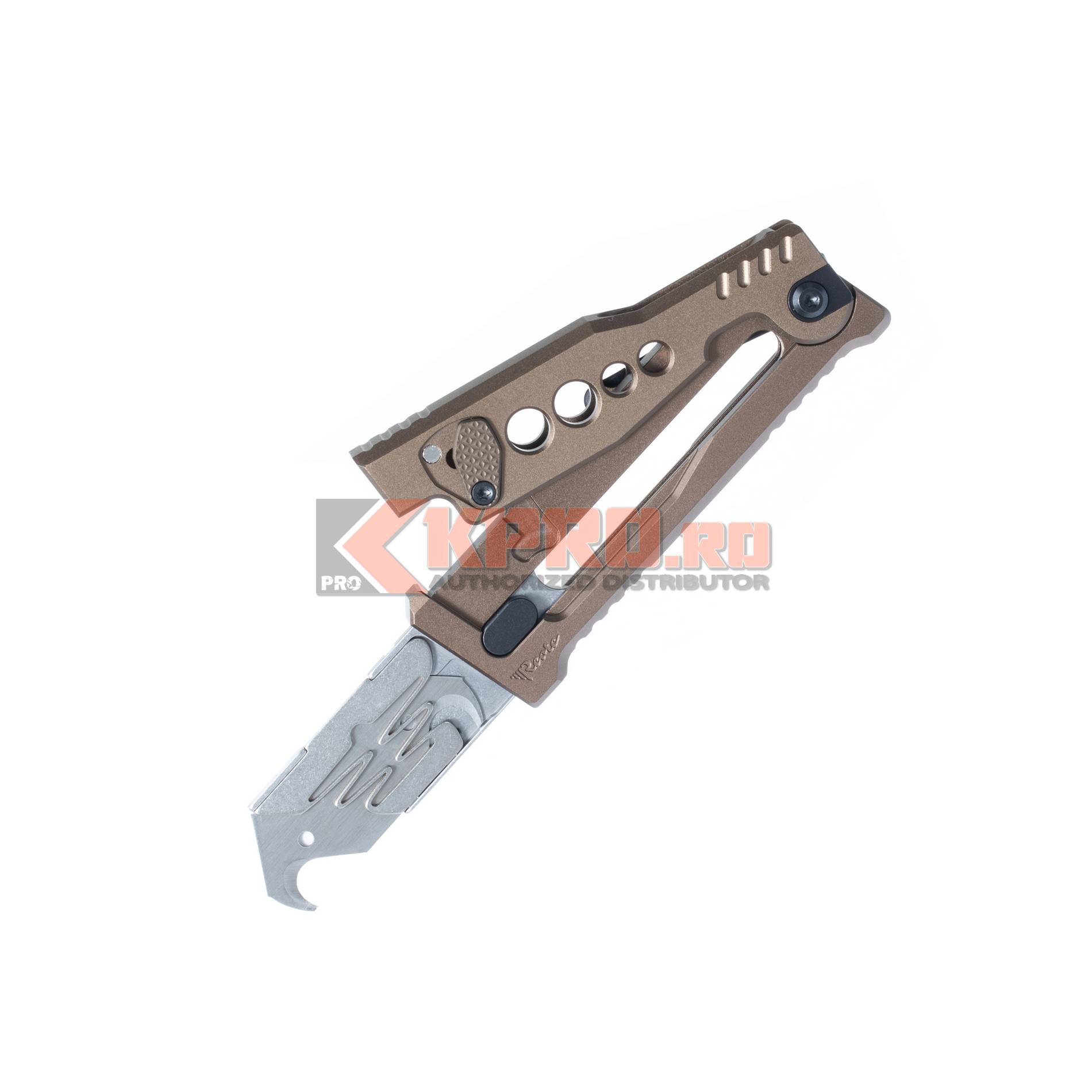 Briceag EDC Reate EXO-U Bronze Speedhole Aluminium Hook Blade OTF manual 01RT091 cu mecanism OTF manual bazat pe gravitație, mâner Speedhole din aluminiu bronzat și lamă tip cârlig interschimbabilă.
