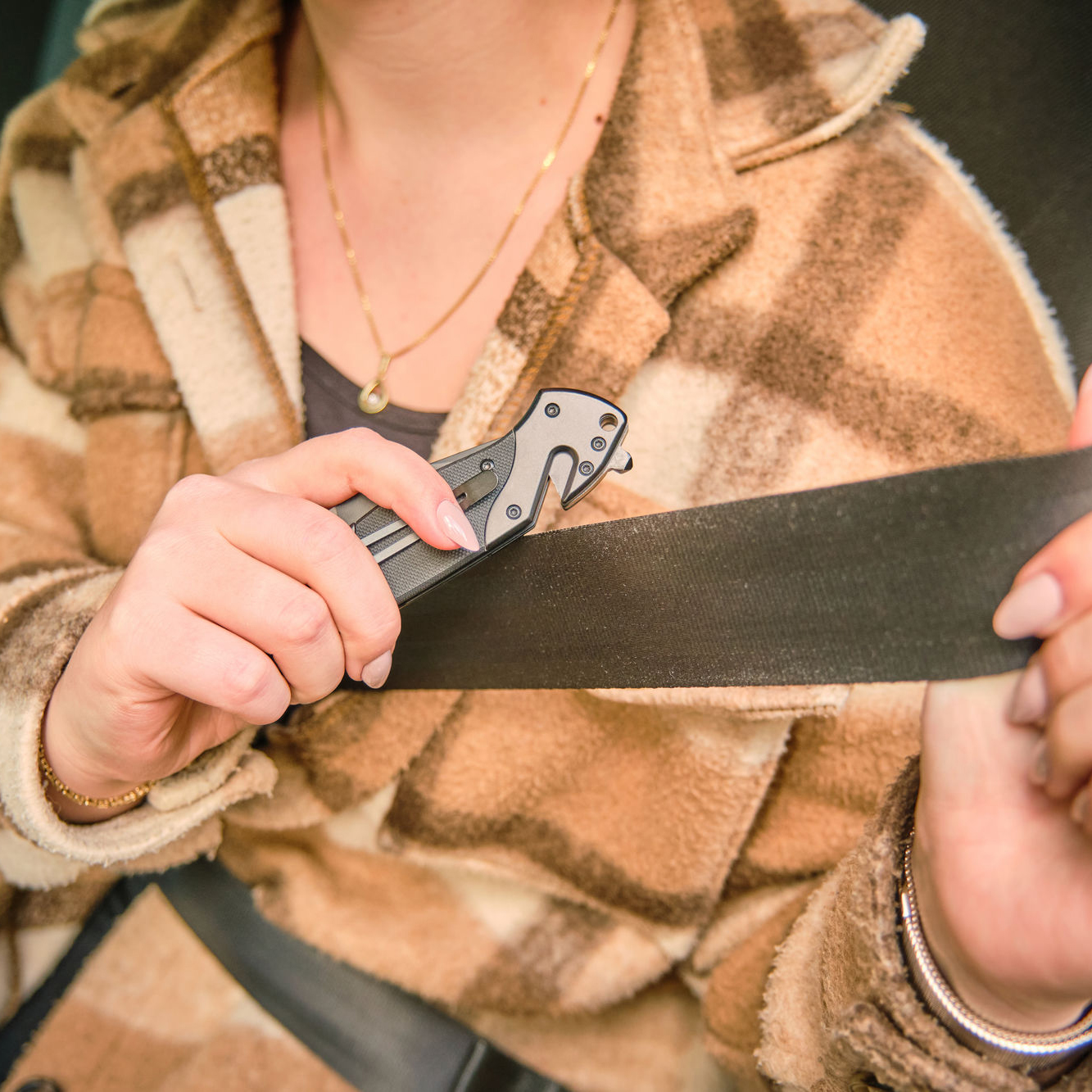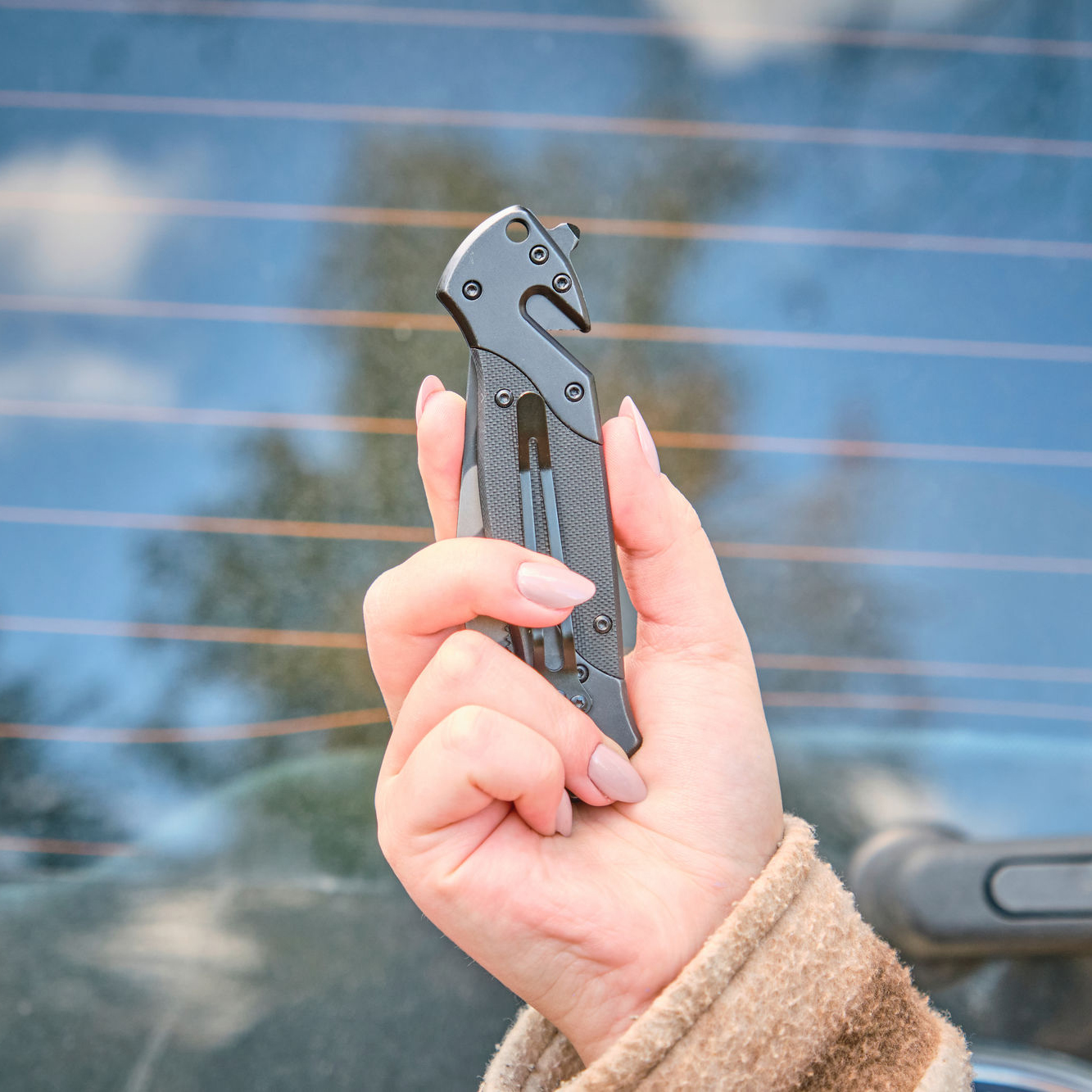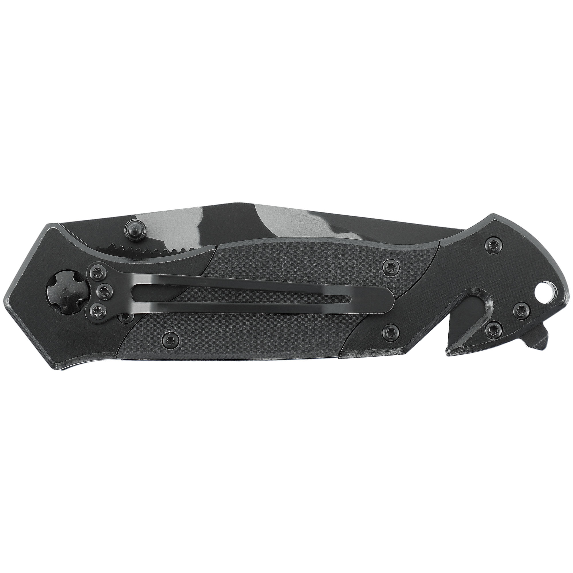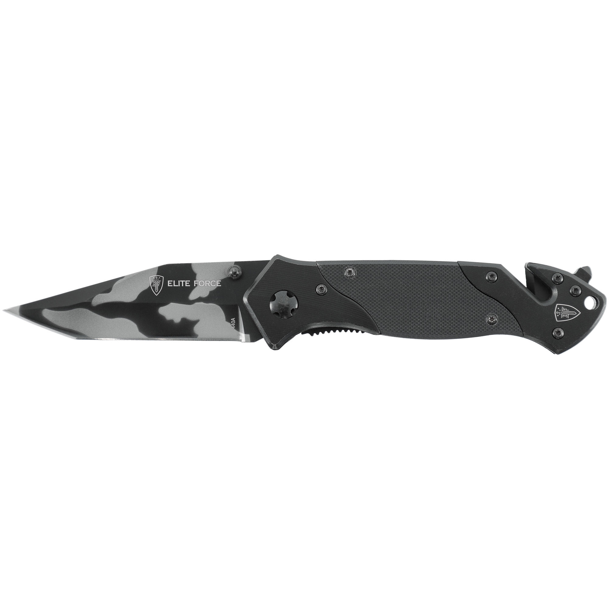 Briceagul este prevazut cu sistem de caiat centuri, spargator geamuri si clips de buzunar.