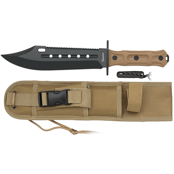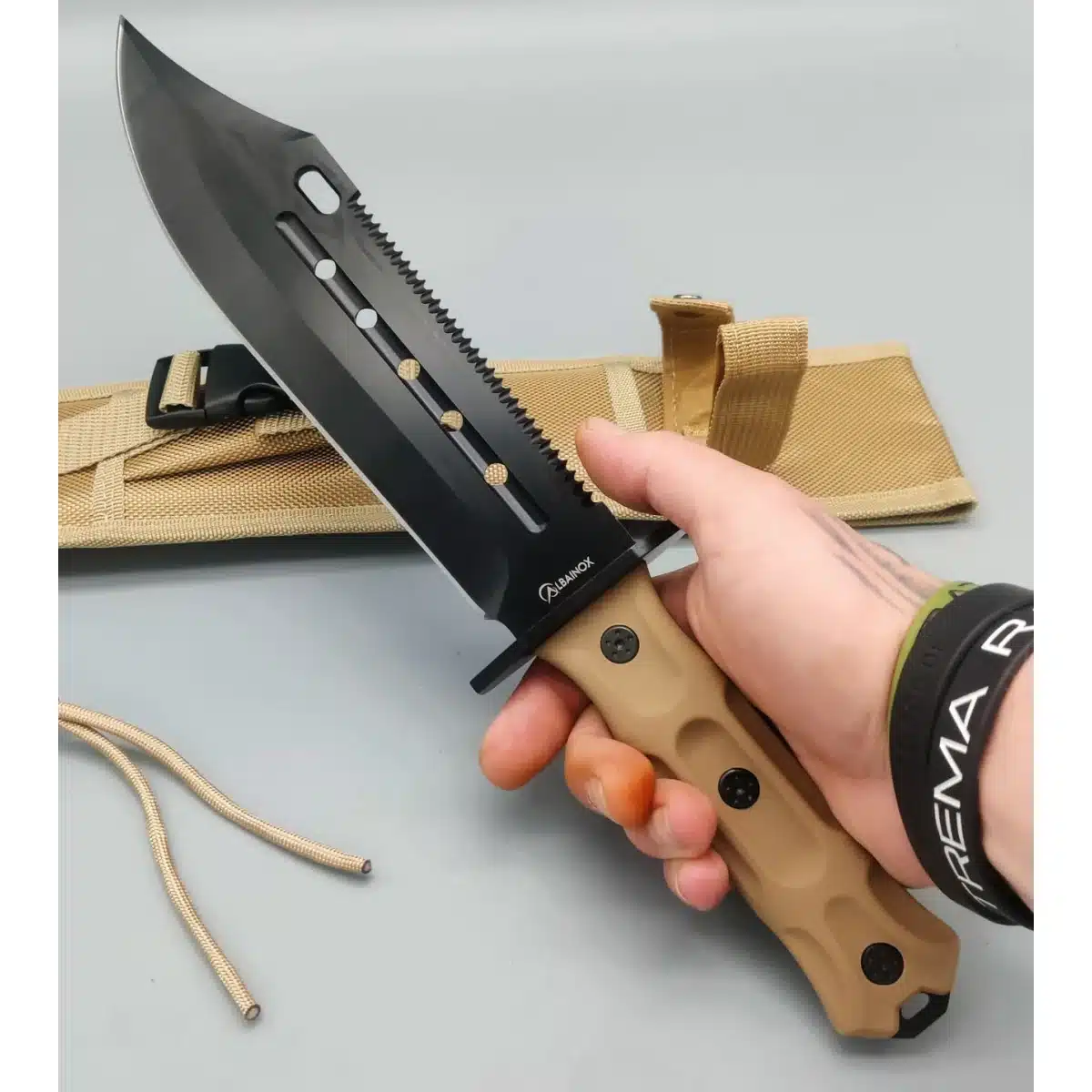 Cutit Tactic Coyote Albainox 32803 cu o lungime totală de 36 cm și o lamă impunătoare de 23 cm, acest model este ideal pentru aplicații militare, outdoor, supraviețuire sau bushcraft.