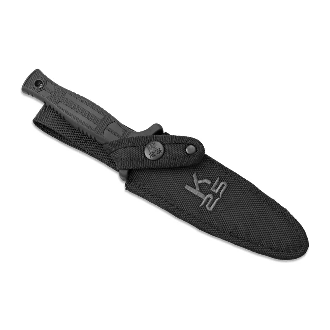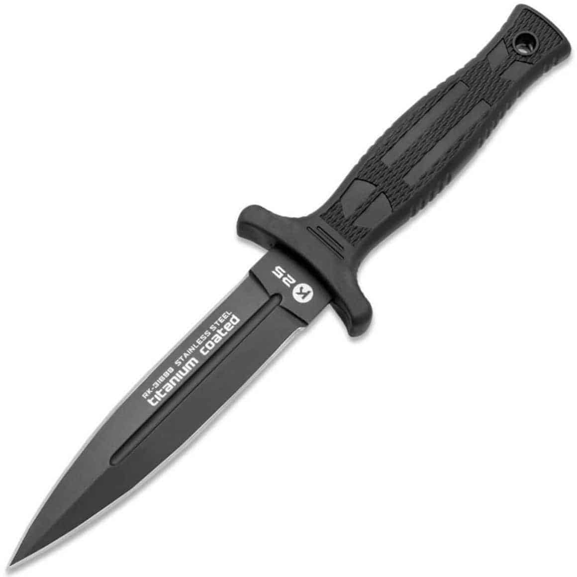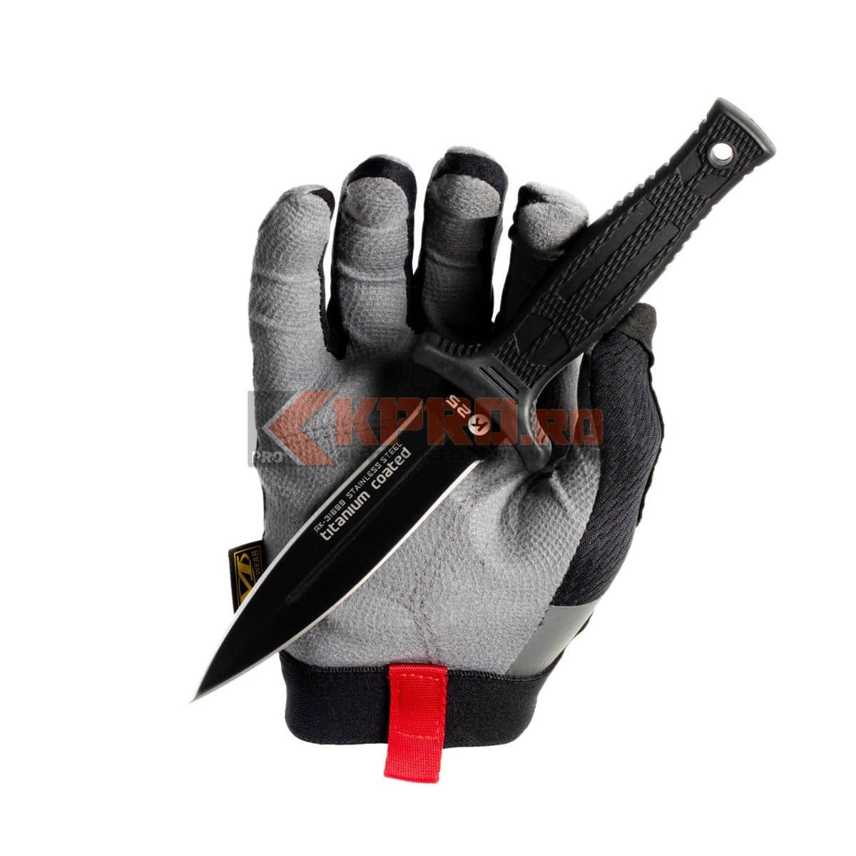 Pumnalul RUI K25 Dagger este echipat cu o lamă dublă față cu acoperire neagră, ceea ce îl face potrivit pentru penetrare și tăiere precisă. Mânerul simetric din cauciuc oferă o aderență excelentă, iar protecția transversală împiedică alunecarea mâinii pe lamă.
