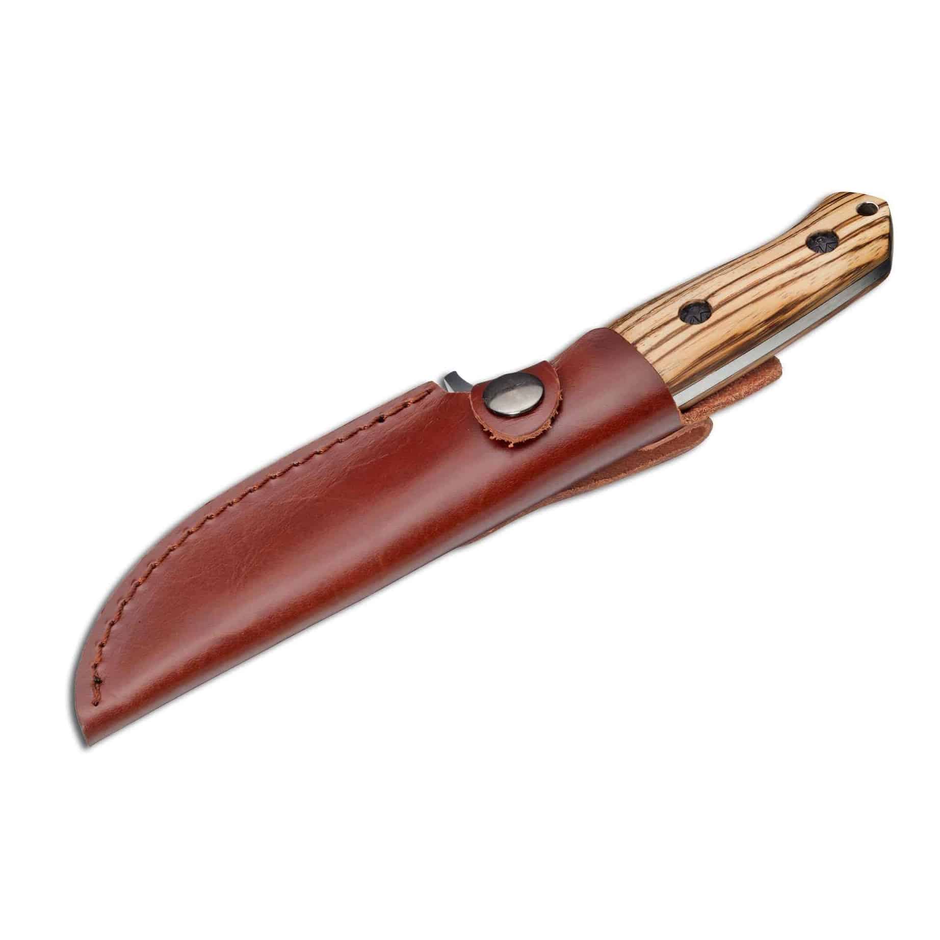 Cuțitul este însoțit de o teacă din piele cu închidere cu capse, ideală pentru purtare sigură.