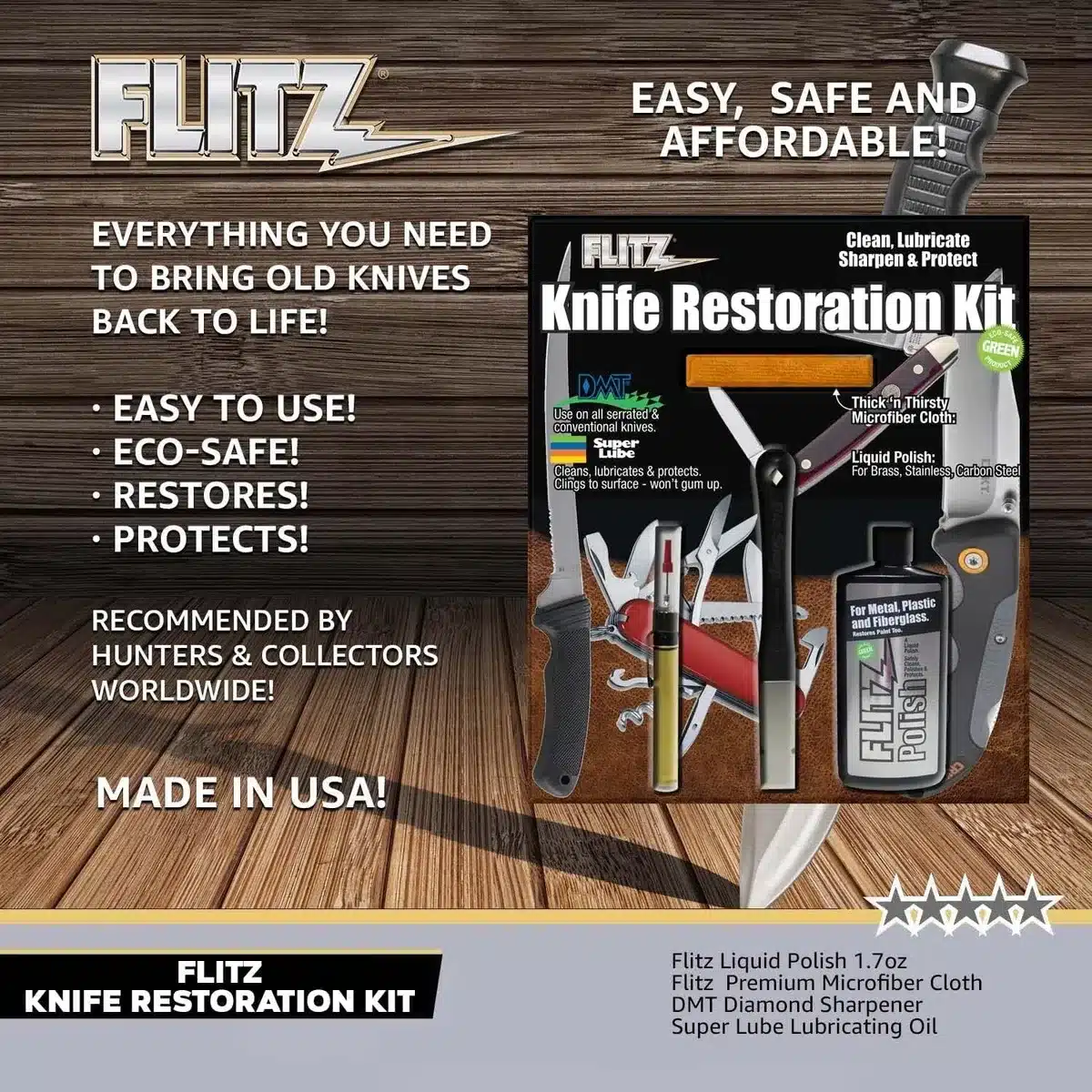 - Descriere: Această soluție lichidă de lustruire de la Flitz elimină eficient amprentele, rugina și alte impurități fără a deteriora suprafața cuțitului. Formula sa neabrazivă și neinflamabilă este sigură de utilizat pe o varietate de materiale, inclusiv oțel inoxidabil, alamă, cupru și titan. Asigură un finisaj strălucitor și protejează suprafața împotriva oxidării și coroziunii.