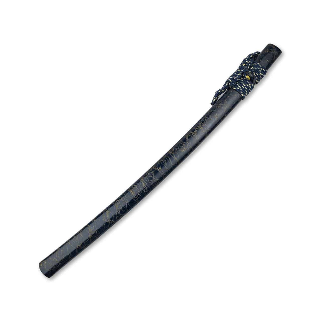 Mânerul din lemn este îmbrăcat într-un tsuka-ito albastru închis, amplasat peste menuki ornamental și completat de o tsuba clasică ce accentuează aspectul japonez autentic.